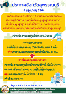 ประธานกรรมการโรคติดต่อจังหวัดสุพรรณบุรี ผู้กำกับการบริหารราชการในสถานการณ์ฉุกเฉินจังหวัดสุพรรณบุรี ประกาศจังหวัดสุพรรณบุรี เรื่อง แนวทางปฏิบัติของเจ้าพนักงานควบคุมโรคติดต่อ ในกรณีที่ประชาชนเดินทางมาจากพื้นที่ควบคุมสูงสุดและเข้มงวด พื้นที่ควบคุมสูงสุด เข้าจังหวัดสุพรรณบุรีตามคำสั่งจังหวัดสุพรรณบุรี ที่ ๑๙๙๙/๒๕๖๔ ลงวันที่ ๑๖ พฤษภาคม ๒๕๖๔ได้มีข้อกำหนดมาตรการให้ผู้ที่เดินทางมาจากจังหวัดพื้นที่ควบคุมสูงสุดและเข้มงวด หรือเดินทางมาจากจังหวัดพื้นที่ควบคุมสูงสุด ตามข้อกำหนดออกตามความในมาตรา ๙ แห่งพระราชกำหนดการบริหารราชการในสถานการณ์ฉุกเฉิน พ.ศ. ๒๕๔๘ (ฉบับที่ ๒๓ มีหน้าที่รายงานตนต่อนายอำเภอ หรือกำนัน ผู้ใหญ่บ้าน เจ้าหน้าที่สาธารณสุข และให้เจ้าบ้าน ผู้ควบคุมดูแลบ้าน เจ้าของสถานประกอบการ หรือสถานที่อื่นใด