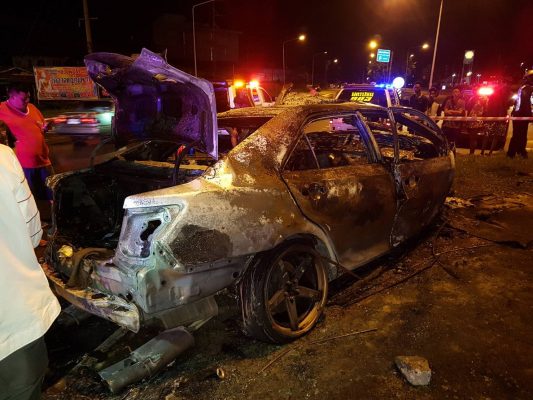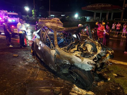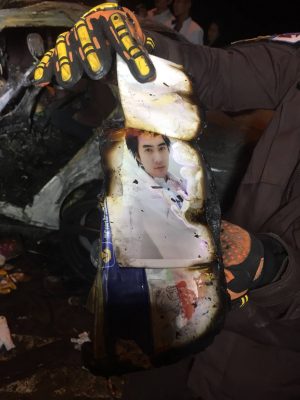 ที่เกิดเหตุ เจ้าหน้าที่หลายฝ่ายกำลังช่วยกันควบคุมเพลิงที่กำลังลุกไหม้รถยนต์เก๋ง Toyota Camry สีขาวทะเบียน 3กฎ 4141 กทม. ซึ่งมีสภาพ พังยับ จากการตรวจสอบ พบรอยเบรคเป็นทางยาวก่อนจะ พุ่งชนเกาะยูเทิร์น จนเกิดเพลิงไหม้ หลังเพลิงสงบพบ ร่างผู้เสียชีวิตสภาพไหม้เกรียมอยู่ในที่นั่งคนขับ 1 ศพ เป็นชายและที่นั่งผู้โดยสารตอนหน้าด้านซ้าย 1 ศพ เบื้องต้นคาดว่าจะเป็นหญิง และการตรวจสอบ เอกสารที่ ยังไม่ถูกเพลิงเผาเสียหาย พบบัตรประจำตัวประชาชนระบุชื่อนางสาวจิราพร โต้งฟ้า เกิดวันที่ 9 กุมภาพันธ์ 2541 อยู่บ้านเลขที่ 35/1 หมู่ 3 ตำบลนาสวนอำเภอศรีสวัสดิ์จังหวัดกาญจนบุรี และพบเอกสารกรมธรรม์ประกันภัย บริษัทวิริยะประกันภัย ประกันรถยนต์ Toyota Camry ทะเบียน 3กฎ.4141 กทม.ระบุชื่อเจ้าของทรัพย์ ที่ประกัน ชื่อนายชินโชติ หวายนำ เกิดวันที่ 17 มกราคม 2531 อยู่บ้านเลขที่ 109/336 หมู่ 17 ตำบลบางเสาธง อำเภอบางเสาธง จังหวัดสมุทรปราการ กับภาพถ่าย สุภาพบุรุษหน้าตาดี ซึ่งใบหน้าตรงกับในเอกสารสำเนา ข้อมูลทะเบียนราษฎร์ของนายชินโชติ หวายนำ ซึ่งยังไม่สามารถยืนยันได้ว่าศพผู้เสียชีวิตถูกไฟไหม้คาซากรถจะ เป็นบุคคลทั้งสอง ที่พบเอกสาร ในรถหรือไม่ หลัง ควบคุมเพลิงและนำ ร่างผู้เสียชีวิตออกมา ส่ง ส่งโรงพยาบาลศูนย์นครปฐมเพื่อ ผ่าพิสูจน์และหาอัตลักษณ์บุคคล เพื่อติดต่อ ญาติ