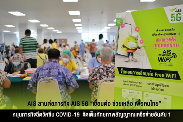 สำหรับภารกิจการฉีดวัคซีน COVID-19 นับว่าเป็นอีกหนึ่งเป้าหมายหลักของประเทศในการรับมือกับสถานการณ์การแพร่ระบาดของ COVID-19 โดยหนึ่งในปัจจัยหลักที่สำคัญยิ่งในภารกิจดังกล่าว คือ เครือข่ายสื่อสาร เพื่อช่วยให้ภารกิจสำคัญของบุคลากรทางการแพทย์ลุล่วงตามเป้าหมายการสร้างภูมิคุ้มกันให้กับประชาชน   AIS จึงเดินหน้าอยู่เคียงข้างการทำงานของภาคสาธารณสุข ในภารกิจสร้างภูมิคุ้มกันหมู่ให้กับคนไทย ผ่านการสนับสนุนศักยภาพสัญญาณเครือข่าย 5G, 4G และ Free WIFI