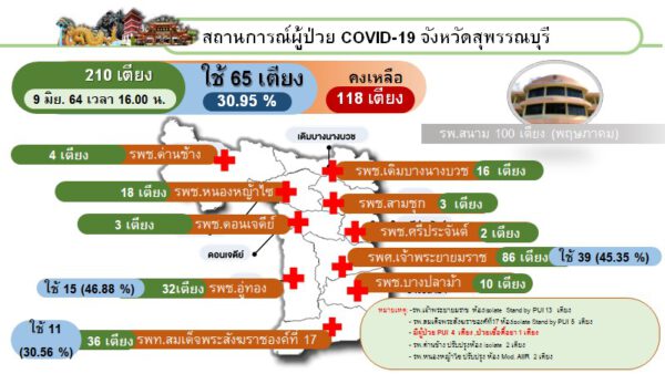 วันนี้ (10 มิ.ย.64) คณะกรรมการโรคติดต่อจังหวัดสุพรรณบุรี เปิดเผยข้อมูล รายงานสถานการณ์การใช้เตียง ประจำวันที่ 9 มิถุนายน 2564 เวลา 16.00 น.สืบเนื่องจากมีการปรับปรุงจำนวนเตียง ในจังหวัดสุพรรณบุรี. ของโรงพยาบาลศรีประจันต์ โดยโรงพยาบาลศรีประจันต์ จะปิดตึกที่ให้บริการผู้ป่วยโควิช 19 เพื่อปรับปรุงห้องพักให้มีประสิทธิภาพดียิ่งขึ้น จึงทำให้จำนวนเตียงมี 210 เตียง มีผู้ป่วย covid -19 ทั้งหมด 65 คน คิดเป็นร้อยละ 30.95 ของ จำนวนเตียงทั้งหมด คงเหลือเตียงห้อง isolate และcohort ward พร้อมให้บริการ 118 เตียง และเมื่อจำแนกผู้ป่วยตามระดับความความรุนแรง ดังนี้