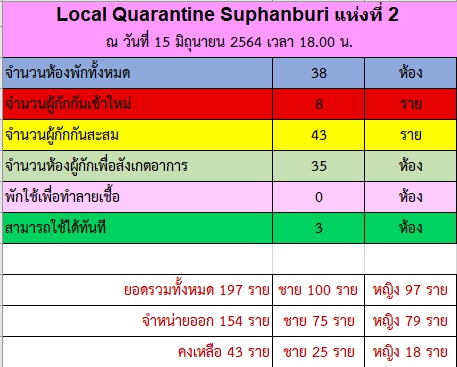 ด้าน Local Quarantine Suphanburi แห่งที่ 2 ข้อมูล ณ วันที่ 15 มิถุนายน 2564 เวลา 18.00 น. จำนวนห้องพักทั้งหมด 38 ห้อง สามารถใช้ได้ทันที 3 ห้อง