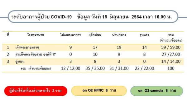 วันนี้ (16มิ.ย.64) คณะกรรมการโรคติดต่อจังหวัดสุพรรณบุรี เปิดเผยข้อมูล รายงานสถานการณ์การใช้เตียง ประจำวันที่ 15 มิถุนายน 2564 เวลา 16.00 น. จำนวนเตียงทั้งหมด 206 เตียง มีผู้ป่วย covid -19 ทั้งหมด 100 คน คิดเป็นร้อยละ 48.54 ของ จำนวนเตียงทั้งหมด คงเหลือเตียงพร้อมให้บริการ 78 เตียง และเมื่อจำแนกผู้ป่วยตามระดับความความรุนแรง ดังนี้