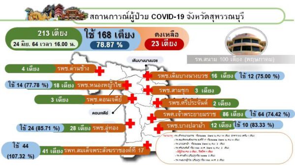 ด้าน Local Quarantine Suphanburi แห่งที่ 2 ข้อมูล ณ วันที่ 24 มิถุนายน 2564 เวลา 18.00 น. จำนวนห้องพักทั้งหมด 38 ห้อง พักใช้เพื่อทำลายเชื้อ- ห้อง สามารถใช้ได้ทันที 4 ห้อง