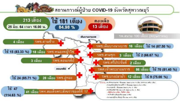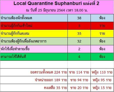 ด้าน Local Quarantine Suphanburi แห่งที่ 2 ข้อมูล ณ วันที่ 25 มิถุนายน 2564 เวลา 18.00 น. จำนวนห้องพักทั้งหมด 38 ห้อง พักใช้เพื่อทำลายเชื้อ 2 ห้อง สามารถใช้ได้ทันที 4 ห้อง