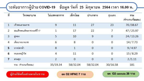 วันนี้ ( 26 มิ.ย.64) คณะกรรมการโรคติดต่อจังหวัดสุพรรณบุรี เปิดเผยข้อมูล รายงานสถานการณ์การใช้เตียง ประจำวันที่ 25 มิถุนายน 2564 เวลา 16.00 น. จำนวนเตียงทั้งหมด 213 เตียง ใช้ 181 เตียง คงเหลือเตียงห้อง พร้อมให้บริการ 13 เตียง และเมื่อจำแนกผู้ป่วยตามระดับความความรุนแรง ดังนี้