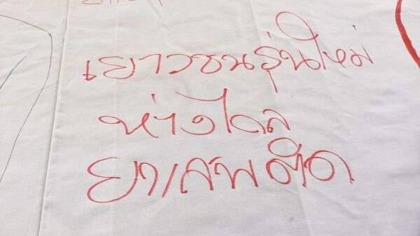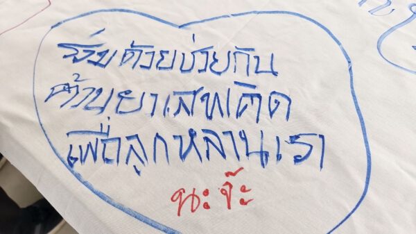 จากนั้น นายวัชรินทร์ จันทร์เดช ประธานเครือข่ายกองทุนแม่ฯ ได้กล่าวถึงวัตถุประสงค์ในการจัดงาน ว่า วันที่ 26 มิถุนายนของทุกปี เป็นวันต่อต้านยาเสพติดโลก ซึ่งเป็นวันสำคัญวันหนึ่ง ที่จะได้ร่วมกันจัดกิจกรรมการรณรงค์ ซึ่งในปีนี้ เป็นการจัดเล็ก แต่ได้มีความหมาย เพื่อให้ประชาชนได้รับรู้ถึงสถานการณ์ยาเสพติด โดยมีการให้ความรู้เรื่องของพิษภัยยาเสพติด เรื่องของสถานการณ์เรื่องยาเสพติด มีการแลกเปลี่ยนพูดคุยกัน เพื่อให้ทุกคนได้แสดงหลักคิด แนวคิดในเรื่องของสถานการณ์ด้านยาเสพติดลงในแผ่นผ้าที่ร่วมกันเขียนบรรยาย นำไปประชาสัมพันธ์ต่อๆกันไป ในเรื่องของพิษภัยยาเสพติด และได้มอบใบประกาศเกียรติคุณให้กับผู้ที่ร่วมกันต่อต้านยาเสพติดในรอบปี เนื่องจากสถานการณ์ช่วงนี้ เป็นสถานการณ์ที่หนัก เจอหลายปัญหาพร้อมๆกัน ทุกคนจึงต้องร่วมกันสร้างจิตสำนึก สร้างชุมชนให้เข็มแข็ง