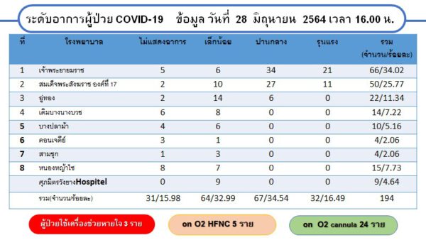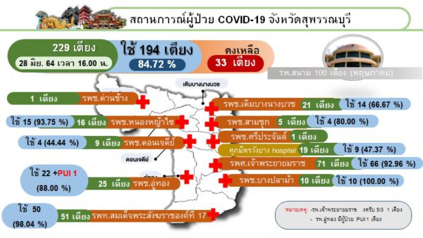 ด้าน Local Quarantine Suphanburi แห่งที่ 2 ข้อมูล ณ วันที่ 28 มิถุนายน 2564 เวลา 18.00 น. จำนวนห้องพักทั้งหมด 38 ห้อง พักใช้เพื่อทำลายเชื้อ – ห้อง สามารถใช้ได้ทันที 3 ห้อง
