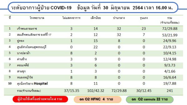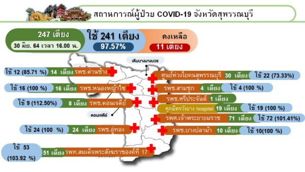 ด้าน Local Quarantine Suphanburi แห่งที่ 2 ข้อมูล ณ วันที่ 30 มิถุนายน 2564 เวลา 18.00 น. จำนวนห้องพักทั้งหมด 38 ห้อง พักใช้เพื่อทำลายเชื้อ 1 ห้อง สามารถใช้ได้ทันที 1 ห้อง
