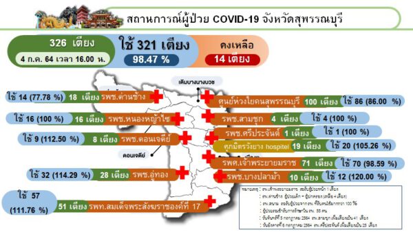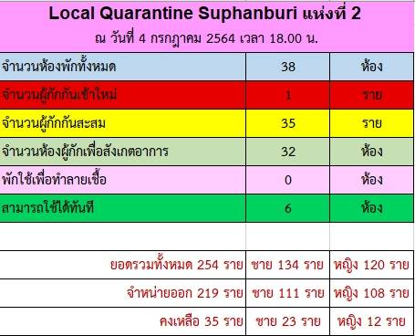 ด้าน Local Quarantine Suphanburi แห่งที่ 2 ข้อมูล ณ วันที่ 4 กรกฎาคม 2564 เวลา 18.00 น. จำนวนห้องพักทั้งหมด 38 ห้อง พักใช้เพื่อทำลายเชื้อ – ห้อง สามารถใช้ได้ทันที 6 ห้อง