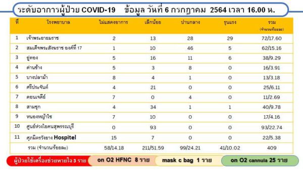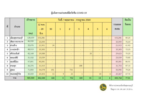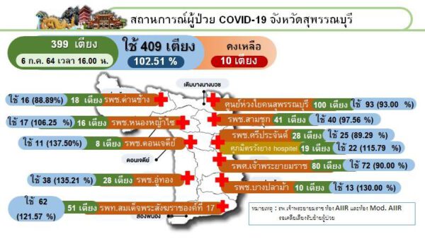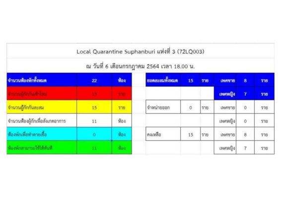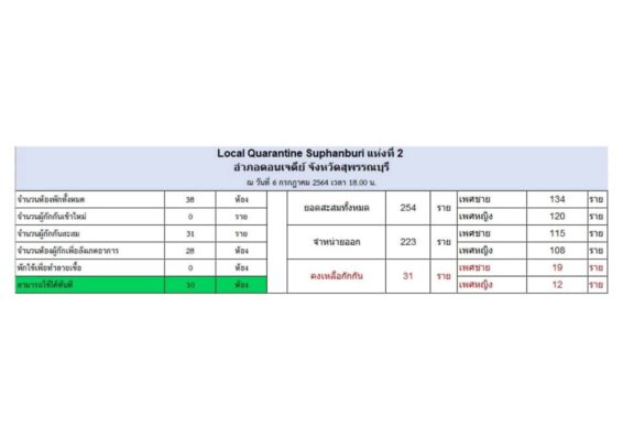 ด้าน Local Quarantine Suphanburi ณ วันที่ 6 กรกฎาคม 2564 เวลา 18.00 น. แห่งที่ 2 ข้อมูล จำนวนห้องพักทั้งหมด 38 ห้อง สามารถใช้ได้ทันที 10 ห้องพักใช้เพื่อทำลายเชื้อ – ห้อง /แห่งที่ 3 ข้อมูล จำนวนห้องพักทั้งหมด 22 ห้อง สามารถใช้ได้ทันที 11 ห้อง