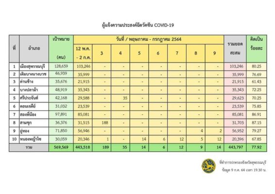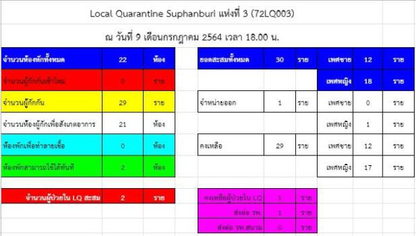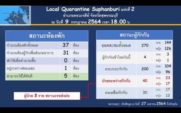 ด้าน Local Quarantine Suphanburi ข้อมูล ณ วันที่ 9 กรกฎาคม 2564 เวลา 18.00 น. แห่งที่ 2 มีจำนวนห้องพักทั้งหมด 37 ห้อง พักใช้เพื่อทำลายเชื้อ 1 ห้อง สามารถใช้ได้ทันที 5 ห้อง/แห่งที่ 3 มีจำนวนห้องพักทั้งหมด 22 ห้อง สามารถใช้ได้ทันที 2 ห้อง