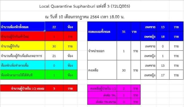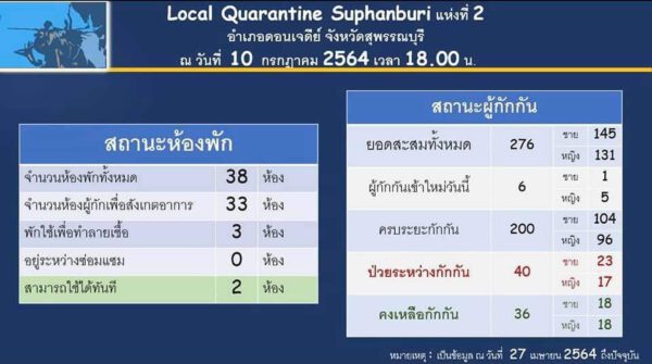 ด้าน Local Quarantine Suphanburi ข้อมูล ณ วันที่ 9 กรกฎาคม 2564 เวลา 18.00 น. แห่งที่ 2 มีจำนวนห้องพักทั้งหมด 38 ห้อง สามารถใช้ได้ทันที 2 ห้อง/แห่งที่ 3 มีจำนวนห้องพักทั้งหมด 22 ห้อง สามารถใช้ได้ทันที 1 ห้อง