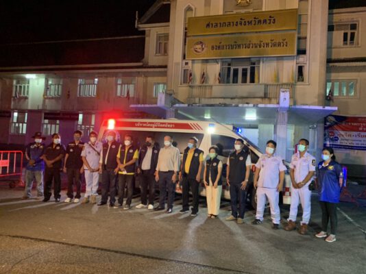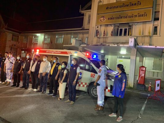 ที่บริเวณด้านหน้าสำนักงานองค์การบริหารส่วนจังหวัดตรัง นายบุ่นเล้ง โล่สถาพรพิพิธ นายก อบจ.ตรัง พร้อมด้วยนายโชคดี คีรีกิ้น รองนายก อบจ.ตรัง นายจารึก ทองหนัน รองนายก อบจ.ตรัง นายกิตติเดช วรรณบวร ประธานสภา อบจ.ตรัง ปลัด อบจ.ตรัง และสมาชิกสภา อบจ.ตรัง เขตอำเภอเมืองตรัง ปล่อยรถกู้ภัย ซึ่งเป็นของมูลนิธิสว่างภักดีตรัง จำนวน 1 คัน เพื่อไปรับผู้ป่วยโควิด -19 ยืนยันจากกรุงเทพฯ และปริมณฑล จำนวน 8 ราย ที่ไม่มีเตียงรักษา กลับมารักษาตัวที่โรงพยาบาลสนามใน จ.ตรัง