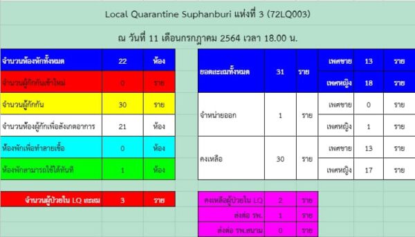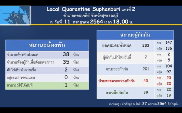 ด้าน Local Quarantine Suphanburi ข้อมูล ณ วันที่ 11 กรกฎาคม 2564 เวลา 18.00 น. แห่งที่ 2 มีจำนวนห้องพักทั้งหมด 38 ห้อง สามารถใช้ได้ทันที 5 ห้อง/แห่งที่ 3 มีจำนวนห้องพักทั้งหมด 22 ห้อง สามารถใช้ได้ทันที 1 ห้อง