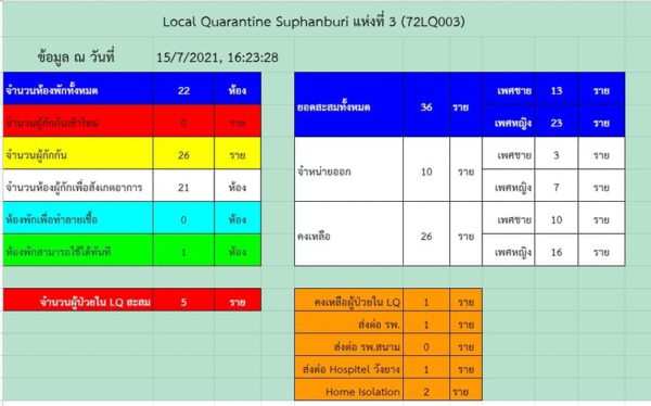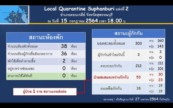 ด้าน Local Quarantine Suphanburi ข้อมูล ณ วันที่ 14 กรกฎาคม 2564 เวลา 18.00 น. แห่งที่ 2 มีจำนวนห้องพักทั้งหมด 38 ห้อง พักเพื่อทำลายเชื้อ 2 ห้อง /แห่งที่ 3 มีจำนวนห้องพักทั้งหมด 22 ห้อง สามารถใช้ได้ทันที 1 ห้อง
