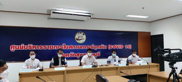 นายคมกริช เจริญพัฒนสมบัติ หัวหน้าสำนักงานจังหวัดสุพรรณบุรี นายเอกภพ จันทร์เพ็ญ หัวหน้าสำนักงานป้องกันและบรรเทาสาธารณภัยจังหวัดสุพรรณบุรี และนายเธียร์รินทร์ ปัทมะนิรันดร์กุล รองปลัดองค์การบริหารส่วนจังหวัดสุพรรณบุรี ร่วมแถลงข่าว สถานการณ์โควิด 19 จังหวัดสุพรรณบุรี กรณีแรงงานต่างด้าว ติดเชื้อเป็นกลุ่มก้อน /การจัดสรรวัคซีนของ อบจ. และการใช้งบประมาณ ในการป้องกันโควิด