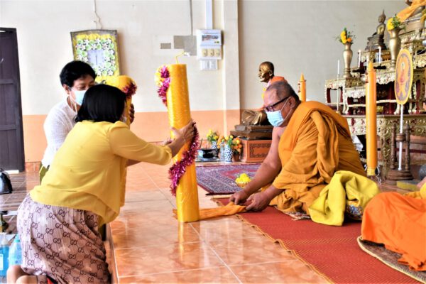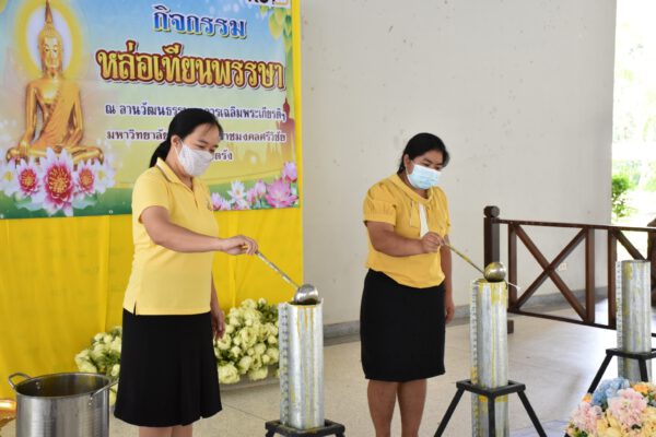 ผศ. โกสินทร์ พัฒนมณี รองอธิการบดีประจำวิทยาเขตตรัง ได้มอบหมายให้ นางอุษา ศรีเจริญ ผู้อำนวยการสำนักงานวิทยาเขตตรังเป็นประธานในพิธีถวายเทียนพรรษาประจำปี 2564 พร้อมด้วยบุคลากร มหาวิทยายาลัยเทคโนโลยีราชมงคลศรีวิชัย วิทยาเขตตรัง เข้าร่วมกิจกรรมทำบุญถวายเทียนพรรษา ผ้าอาบน้ำฝน เครื่องอุปโภคบริโภคและปัจจัย โดยการทำกิจกรรมดังกล่าวได้ยึดถือปฏิบัติกันเป็นประจำทุกปีนั้น นางเมธาพร หิรัญวงศ์ หัวหน้างานบริการการศึกษา ในนามของผู้จัดกิจกรรมถวายเทียนพรรษาประจำปี 2564 ได้เห็นถึงความสำคัญและตระหนักถึงมาตรการป้องกันการแพร่ระบาดของโรคCOVID -19 จึงเปิดโอกาสให้บุคลากรได้มีส่วนร่วมในการถวายเทียนพรรษา ซึ่งได้ดำเนินกิจกรรมต่อเนื่องโดยการเชิญชวนให้บุคลกรร่วมหล่อเทียนพรรษาตั้งแต่วันที่ 5 – 16 กรกฎาคม 2564 ณ ลานกิจกรรม อาคารเฉลิมพระเกียรติฯ มทร.ศรีวิชัย วิทยาเขตตรัง