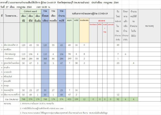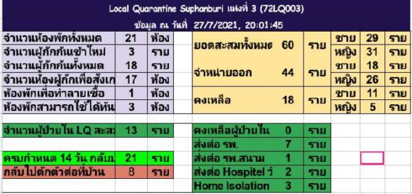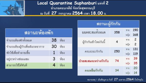 ด้าน Local Quarantine Suphanburi ข้อมูล ณ วันที่ 27 กรกฎาคม 2564 เวลา 18.00 น. แห่งที่ 2 มีจำนวนห้องพักทั้งหมด 38 ห้อง พักเพื่อทำลายเชื้อ 1 ห้อง อยู่ระหว่างซ่อมแซม 3 ห้อง สามารถใช้ได้ทันที 4 ห้อง /แห่งที่ 3 มีจำนวนห้องพักทั้งหมด 22 ห้อง พักเพื่อทำลายเชื้อ 1 ห้อง สามารถใช้ได้ทันที 3 ห้อง