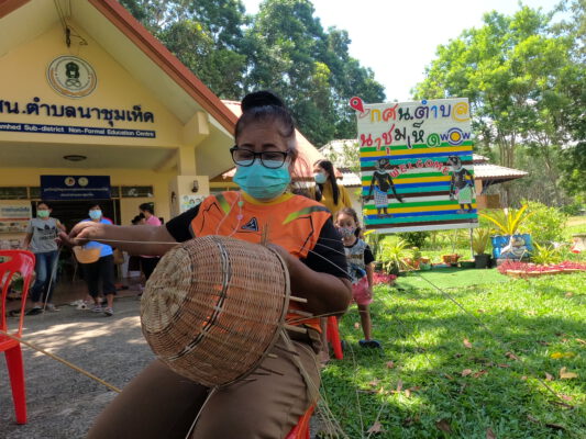 ครู กศน.ตำบลนาชุมเห็ด อ.ย่านตาขาว จ.ตรัง รื้อฟื้นภูมิปัญญาจักรสานสร้างอาชีพให้ชุมชน หลังจากแม่บ้านตกงานออกไปทำงานต่างพื้นที่ไม่ได้เพราะการระบาดของโควิด-19 ด้วยการสำรวจความต้องการและร่วมค้นหาวัตถุดิบที่มีอยู่มากในชุมชน ก็พบว่า ชาวบ้านและแม่บ้านในชุมชนมีพื้นฐานการทำการจักรสานภาชนะด้วยต้นคลุ้ม ต้นคล้า ซึ่งเป็นพืชที่มีมากในชุมชน