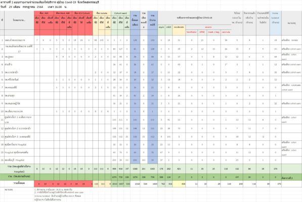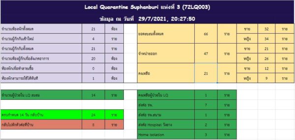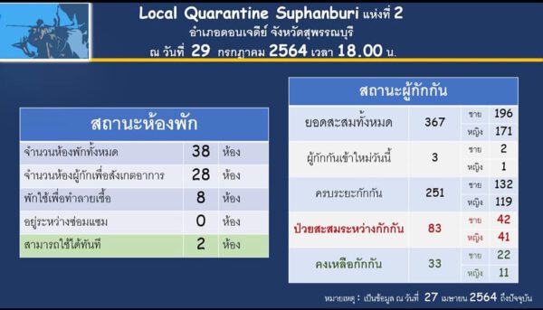 ด้าน Local Quarantine Suphanburi ข้อมูล ณ วันที่ 29 กรกฎาคม 2564 เวลา 18.00 น. แห่งที่ 2 มีจำนวนห้องพักทั้งหมด 38 ห้อง พักเพื่อทำลายเชื้อ 8 ห้อง สามารถใช้ได้ทันที 2 ห้อง /แห่งที่ 3 มีจำนวนห้องพักทั้งหมด 22 ห้อง สามารถใช้ได้ทันที 1 ห้อง