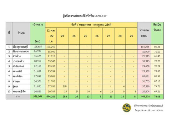 ขณะที่ยอดจำนวนผู้ลงทะเบียนขอรับการฉีดวัคซีน COVID-19 เมื่อวันที่ 27 กรกฎาคม 2564 เวลา 19.00 น. มียอดรวมสะสม 444,578 คน คิดเป็นร้อยละ 78.06