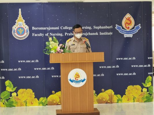 ด้าน ดร.พิศิษฐ์ พลธนะ ผู้อำนวยการวิทยาลัยพยาบาลบรมราชชนนี สุพรรณบุรี กล่าวเพิ่มเติมว่า วิทยาลัย ฯ ได้ดำเนินการอบรมระหว่างวันที่ ๒ – ๒๗ สิงหาคม ๒๕๖๔ เป็นเวลา ๔ สัปดาห์ โดยรูปแบบการอบรมเป็นแบบผสมผสานระหว่างการอบรมแบบออนไลน์ จำนวน ๓ สัปดาห์ ระหว่างวันที่ ๒ – ๒๐ สิงหาคม ๒๕๖๔ และอบรมแบบ Face-to-Face ณ วิทยาลัยพยาบาลบรมราชชนนี สุพรรณบุรี จำนวน ๑ สัปดาห์ ระหว่างวันที่ ๒๓ – ๒๗ สิงหาคม ๒๕๖๔ เพื่อพัฒนาผู้เข้ารับการอบรมให้มีความรู้ ทักษะ สมรรถนะเบื้องต้น ในด้านการบริหารจัดการและการบริหารงาน ตามบทบาทหน้าที่ ความรับผิดชอบ มีความตระหนักถึงบทบาทหน้าที่ในการพัฒนาตนเอง พัฒนางาน และการทำงานร่วมกับผู้อื่นตลอดจนเป็นเวทีในการแลกเปลี่ยนความรู้ ประสบการณ์ เสริมสร้างเครือข่ายในการทำงาน