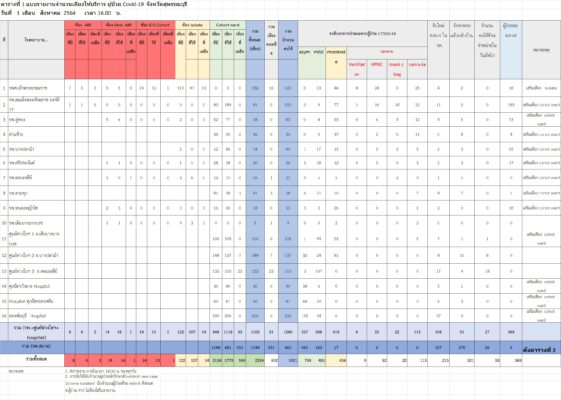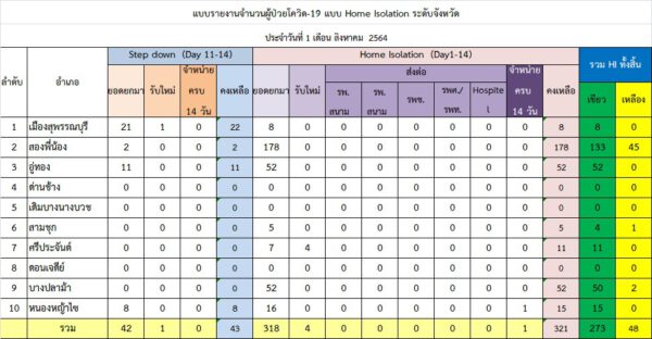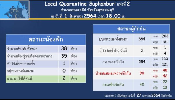 ด้าน Local Quarantine Suphanburi ข้อมูล ณ วันที่ 1 สิงหาคม 2564 เวลา 18.00 น. แห่งที่ 2 มีจำนวนห้องพักทั้งหมด 38 ห้อง พักเพื่อทำลายเชื้อ 1 ห้อง สามารถใช้ได้ทันที 2 ห้อง /แห่งที่ 3 มีจำนวนห้องพักทั้งหมด 22 ห้อง พักเพื่อทำลายเชื้อ 1 ห้อง สามารถใช้ได้ทันที 3 ห้อง