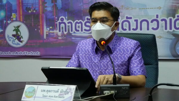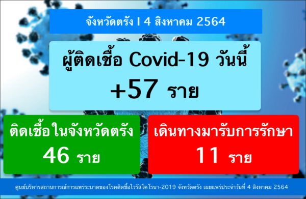 นายแพทย์ตุลกานต์ มักคุ้น นายแพทย์ชำนาญการพิเศษ โรงพยาบาลตรัง ในฐานะโฆษก ศบค.จังหวัดตรัง เปิดเผยว่า ข้อมูล ณ วันที่ 4 สิงหาคม 2564 จังหวัดตรัง พบผู้ติดเชื้อโควิด 19 รายใหม่ รวม 57 ราย แยกเป็นผู้ป่วยในพื้นที่ 46 รายและผู้ป่วยที่รับมาจากพื้นที่สีแดงเข้ม 11 ราย ทำให้มียอดผู้ป่วยสะสมในการระบาดระลอกเดือนเมษายน 2564 จำนวน 2,644 ราย เป็นผู้ป่วยเพศชาย 19 ราย เพศหญิง 38 ราย เป็นคนไทยทั้งหมด และกระจ่ายอยู่ใน 20 คลัสเตอร์ ทำให้อัตราผู้ป่วยรายใหม่เฉลี่ยในรอบสัปดาห์ของจังหวัดตรัง อยู่ที่ 55.7 รายต่อวัน ทางนายขจรศักดิ์ เจริญโสภา ผู้ว่าราชการจังหวัดตรัง จะเพิ่มความเข้มงวดให้มากยิ่งขึ้น แต่ก็ต้องประเมินสถานการณ์การณ์ต่างๆควบคู่กันไป หากเข้มข้นมากก็จะกระทบในหลายๆด้าน หากหย่อนหรือหละหลวมก็จะทำให้เกิดการแพร่ระบาด ขยายเป็นวงกว้าง ในขณะที่ทางจังหวัดก็พยายามเร่งในการฉีดวัคซีนและบริหารจัดการวัคซีนให้ดีที่สุด เพื่อให้ถึงเป้าหมาย 70 เปอร์เซ็นต์ก่อนถึงช่วงฤดูกาลท่องเที่ยว ในช่วงเดือนตุลาคมที่จะถึงนี้ จึงต้องขอความร่วมมือจากประชาชน งดไปในพื้นที่เสี่ยง ส่วนผู้ที่กักตัวอยู่บ้านก็ขอให้กักตัวอยู่ที่บ้านจริงๆ