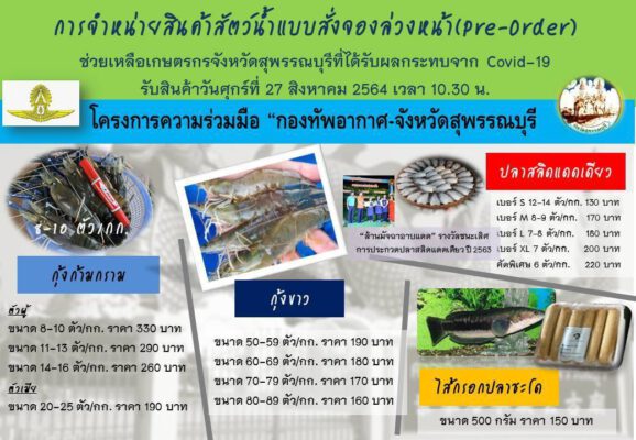 สำนักงานประมงจังหวัดสุพรรณบุรี ร่วมกับกองทัพอากาศ และส่วนราชการในพื้นที่ จัดกิจกรรมจำหน่ายสินค้าสัตว์น้ำ แบบ Pre-Order เพื่อช่วยเหลือเกษตรกรที่ได้รับผลกระทบจากสถานการณ์การแพร่ระบาดของ COVID-19 ระลอกใหม่ โดยจำหน่ายสินค้าสัตว์น้ำ อาทิ กุ้งก้ามกราม กุ้งขาว ปลาสลิดแดดเดียว ไส้กรอกปลาชะโด