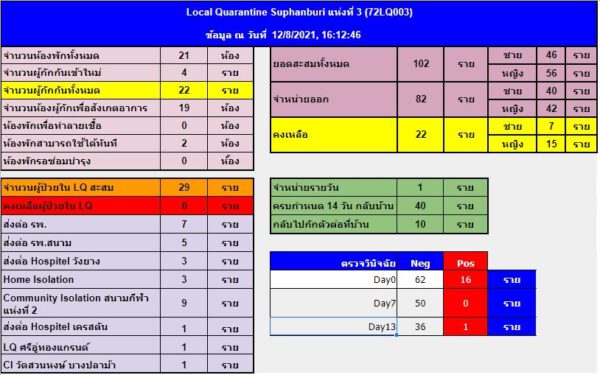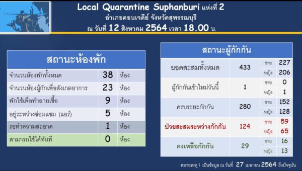 ด้าน Local Quarantine Suphanburi ข้อมูล ณ วันที่ 12 สิงหาคม 2564 เวลา 18.00 น. แห่งที่ 2 มีจำนวนห้องพักทั้งหมด 38 ห้อง พักเพื่อทำลายเชื้อ 9 ห้อง อยู่ระหว่างซ่อมบำรุง 5 ห้อง รอทำความสะอาด 1 ห้อง ไม่สามารถใช้ห้องได้ /แห่งที่ 3 มีจำนวนห้องพักทั้งหมด 22 ห้อง สามารถใช้ได้ทันที 2 ห้อง/ แห่งที่ 4 มีจำนวนห้องพักทั้งหมด 96 ห้อง พักเพื่อทำลายเชื้อ 8 ห้อง สามารถใช้ได้ทันที 5 ห้อง
