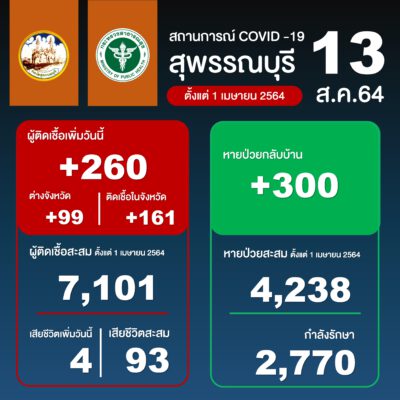 สำหรับสถานการณ์โรค COVID-19 จังหวัดสุพรรณบุรี วันนี้มีผู้ติดเชื้อ 260ราย รวมยอดจำนวนที่พบเชื้อสะสมระรอกใหม่ ตั้งแต่ 1 เมษายน 2564 ถึงปัจจุบัน 7,101 ราย และรักษาหายแล้ว 4,238 ราย คงเหลือกำลังรักษาอีก 2,700 ราย เสียชีวิตเพิ่มวันนี้ 4 ราย เสียชีวิตสะสม 93 ราย