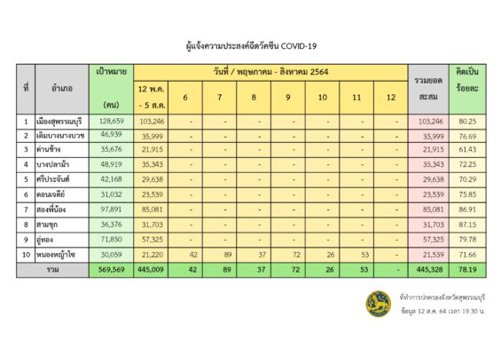 ขณะที่ ยอดจำนวนผู้ลงทะเบียนขอรับการฉีดวัคซีน COVID-19 เมื่อวันที่ 12 สิงหาคม 2564 เวลา 19.30 น. มียอดรวมสะสม 445,328 คน คิดเป็นร้อยละ 78.19