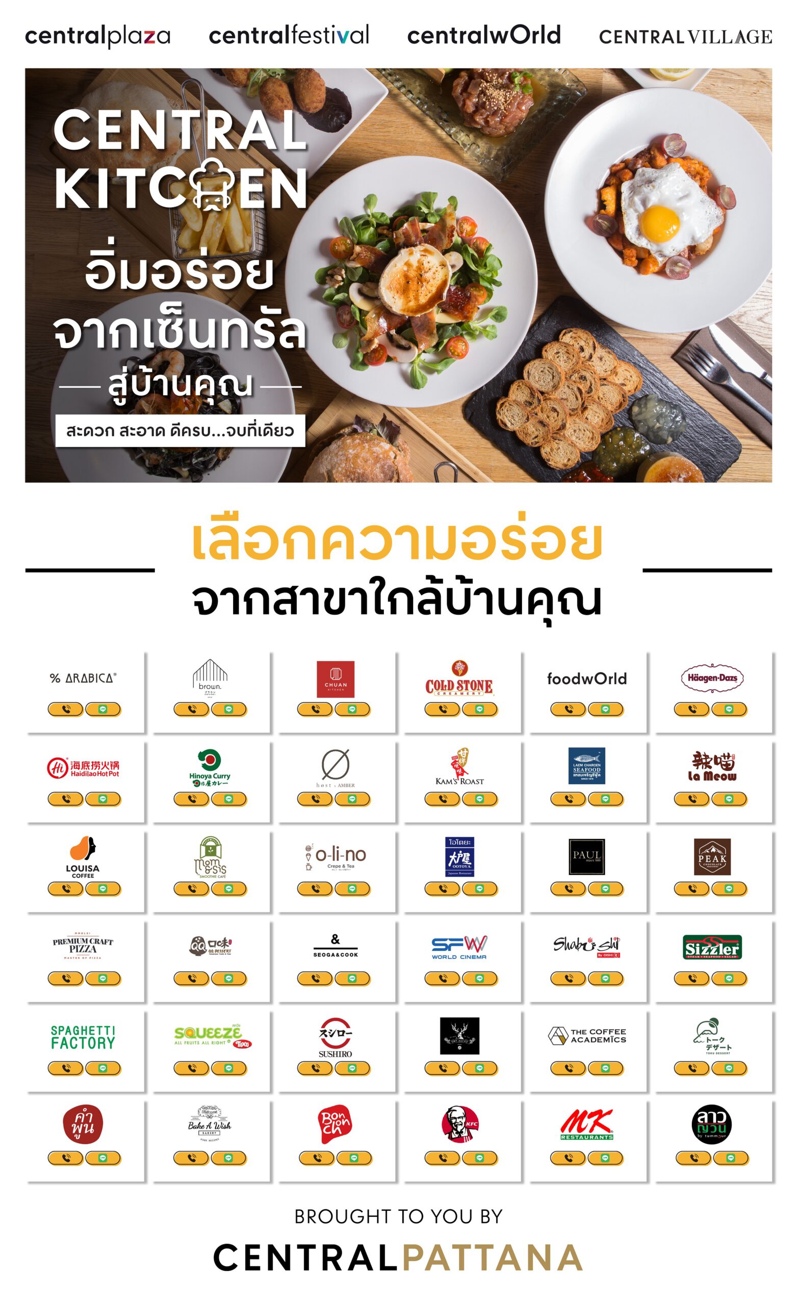 • สะดวก สะอาด ดีครบ จบที่เดียว ทั้งบริการโทรตรงและไลน์สาขา คลิก https://www.centralplaza.co.th/CentralKitchen/ ดูเมนูอร่อยกว่า 2,000 เมนู