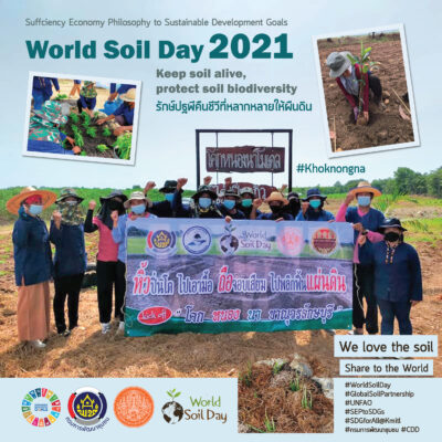 ด้วยวิสัยทัศน์และภารกิจ กรมการพัฒนาชุมชน กระทรวงมหาดไทย และสถาบันเทคโนโลยีพระจอมเกล้าเจ้าคุณทหารลาดกระบัง ร่วมกับภาคีเครือข่ายทุกภาคส่วน ได้ลงนามความความมือและร่วมขับเคลื่อนงานในพื้นที่ต่างๆเพื่อสืบสานศาสตร์พระราชา ปรัชญาของเศรษฐกิจพอเพียงและทฤษฎีใหม่ สู่เป้าหมายความยั่งยืนโลก และมีกิจกรรมด้านการจัดการทรัพยากรดินอย่างยั่งยืนผ่านกิจกรรมหลายโครงการ อาทิ กิจกรรมการพัฒนาทรัพยากรมนุษย์ผ่านการฝึกอบรมเชิงปฏิบัติการในหลักสูตรที่เกี่ยวข้องกับการฟื้นฟูและพัฒนาทรัพยากรดิน น้ำ ป่า อย่างยั่งยืน กิจกรรมการเอามื้อสามัคคีเพื่อร่วมเรียนรู้การฟื้นฟูดินผ่านกระบวนการลงมือทำในพื้นที่จริงด้วยกลไกจิตอาสา กิจกรรมการพัฒนาพื้นที่ต้นแบบการพัฒนาคุณภาพชีวิตตามหลักทฤษฎีใหม่ประยุกต์สู่ “โคก หนอง นา โมเดล” ทั้งแปลงชุมชนต้นแบบ CLM และแปลงครัวเรือนต้นแบบ HLM ทั่วประเทศ กิจกรรมการลงพื้นที่เรียนรู้และทำงานของนักพัฒนาพื้นที่ต้นแบบ( นพต.) ร่วมกับภาคประชาชนในพื้นที่ การพัฒนาศูนย์เรียนรู้การพัฒนาพื้นที่ต้นแบบการพัฒนาคุณภาพชีวิตตามหลักทฤษฎีใหม่ ประยุกต์สู่ โคก หนอง นา พช. ฯลฯ โดยมีวัตถุประสงค์เพื่อส่งเสริมการเรียนรู้การน้อมนำหลักปรัชญาของเศรษฐกิจพอเพียงประยุกต์สู่การปฏิบัติรูปแบบ โคก หนอง นา ด้วยการพัฒนาพื้นที่เรียนรู้ชุมชนต้นแบบ “โคก หนอง นา” ตามหลักปรัชญาของเศรษฐกิจพอเพียงระดับตำบล และระดับครัวเรือน เพื่อฟื้นฟูเศรษฐกิจท้องถิ่นและชุมชนผ่านการสร้างงานสร้างรายได้ให้แก่เกษตรกร แรงงานและบัณฑิตจบใหม่ กลุ่มแรงงานที่อพยพกลับท้องถิ่นและชุมชน ที่ได้รับผลกระทบจากสถานการณ์ในช่วงวิกฤตการแพร่ระบาดของโรคติดเชื้อไวรัสโคโรนา ๒๐๑๙ (COVID – 19) และมีเป้าหมายในการสร้างคุณภาพชีวิตที่ดี สร้างประโยชน์และสร้างความสุขแก่พี่น้องประชาชน ได้อย่างยั่งยืน โดยจะเห็นได้จากกิจกรรมที่กล่าวมาข้างต้นนั้น ล้วนมี ดิน เป็นทรัพยากรธรรมชาติที่สำคัญ ในด้านการขับเคลื่อนโครงการเพื่อพัฒนาคุณภาพชีวิต ร่วมกับการพัฒนากสิกรรมธรรมชาติ ดินเป็นแหล่งผลิตอาหาร ยารักษาโรค สมุนไพร เครื่องนุ่งห่ม และเชื้อเพลิง ดินช่วยพัฒนาระบบนิเวศให้มีความยั่งยืน เอื้อให้เกิดความหลากหลายทางชีวภาพ ช่วยดูดซับคาร์บอน และบรรเทาผลกระทบจากสภาวะการเปลี่ยนแปลงสภาพภูมิอากาศ