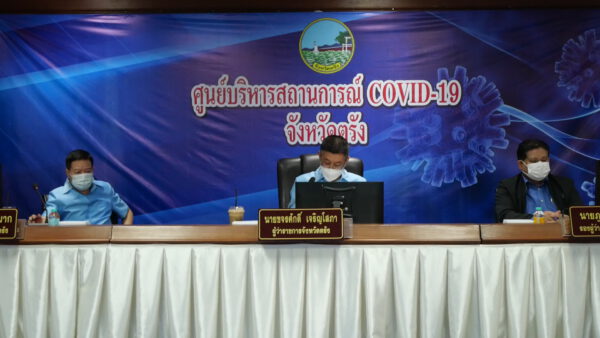 ที่ห้องแถลงข่าว ศบค.จังหวัดตรัง นายขจรศักดิ์ เจริญโสภา ผู้ว่าราชการจังหวัดตรัง จังหวัดตรัง พร้อมด้วยสำนักงานอุตสาหกรรมตังหวัดตรัง, สำนักงานแรงงานจังหวัดตรัง, สำนักงานประกันสังคมจังหวัดตรัง, โรงพยาบาลตรัง ร่วมกันแถลงข่าวซึ่งเป็นมติของคณะกรรมการควบคุมโรคติดต่อจังหวัดตรัง ทั้งนี้จังหวัดตรังพบการติดเชื้อเป็นกลุ่มก้อนในโรงงานอุตสาหกรรม 2 แห่ง โดยโรงงานแห่งแรกเป็นโรงงานผลิตอาหารทะเลแช่แข็ง ตำบลควนปริง อำเภอเมืองตรัง ซึ่งมีพนักงานจำนวน 1,500 คน (ไทย เมียนมา และกัมพูชา) พบว่ามีผู้ติดเชื้อจำนวน 123 คน ซึ่งผู้ประกอบการได้ดำเนินการจัดหาสถานที่แยกกัก (Community Isolation) พนักงานที่ติดเชื้อ รวมถึงจัดหาสถานที่กักกันตัวสำหรับพนักงานผู้สัมผัสเสี่ยงสูง ทั้งนี้ผู้ประกอบการโรงงานได้มีการคัดแยกทันทีหลังจากที่พบว่ามีแม่ค้าติดเชื้อโควิด-19 ที่ทราบเนื่องจาก ทางโรงงานได้นัดฉีดวัคซีนชิโนฟาร์ม แต่ผู้ที่ติดเชื้อนั้นไม่สวามารถฉีดได้เนื่องจากมีการไข้ ทางโรงงานจึงเร่งสอบสวนโรและบุคคลใกล้ชิด จนมาสารถคัดแยกผู้ป่วยได้อย่างรวดเร็ว ลดการติดเชื้อขยายเป็นวงกว้างในโรงงาน ทางผู้ประกอบการมีความรับผิดชอบอย่างมาก และมีการออกค่าใช้จ่ายและดูแลผู้ที่กักตัวด้วย