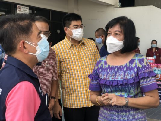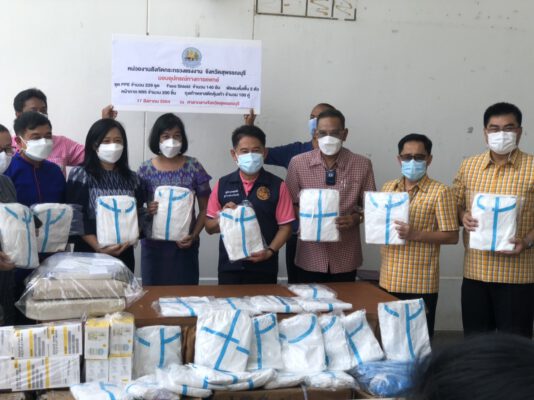 ชุด Face Shield จำนวน 140 อัน หน้ากาก N95 200 ชิ้น ถุงเท้าพลาสติกหุ้มเท้า จำนวน 100 ชิ้น และพัดลมตั้งพื้น จำนวน 2 ตัว โดยข้าราชการ เจ้าหน้าที่ ลูกจ้าง ในหน่วยงานสังกัดกระทรวงแรงงาน