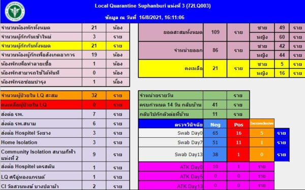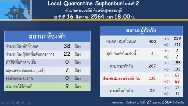ด้าน Local Quarantine Suphanburi ข้อมูล ณ วันที่ 16 สิงหาคม 2564 เวลา 18.00 น. แห่งที่ 2 มีจำนวนห้องพักทั้งหมด 38 ห้อง อยู่ระหว่างซ่อมบำรุง 7 ห้อง สามารถใช้ได้ทันที 9 ห้อง /แห่งที่ 3 มีจำนวนห้องพักทั้งหมด 22 ห้อง พักเพื่อทำลายเชื้อ 1 ห้อง ยังไม่สามารถใช้ได้ขณะนี้
