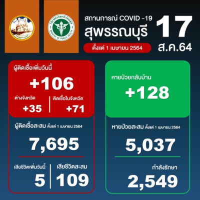 สำหรับสถานการณ์โรค COVID-19 จังหวัดสุพรรณบุรี วันนี้มีผู้ติดเชื้อ 106 ราย รวมยอดจำนวนที่พบเชื้อสะสมระรอกใหม่ตั้งแต่ 1 เมษายน 2564 ถึงปัจจุบัน 7,695 ราย และรักษาหายแล้ว 5,037 ราย คงเหลือกำลังรักษาอีก 2,549 ราย เสียชีวิตเพิ่มวันนี้ 5 ราย เสียชีวิตสะสม 109 ราย ขณะที่ยอดจำนวนผู้ลงทะเบียนขอรับการฉีดวัคซีน COVID-19 เมื่อวันที่ 16 สิงหาคม 2564 เวลา 19.30 น. มียอดรวมสะสม 445,611 คน คิดเป็นร้อยละ 78.24