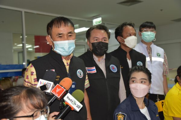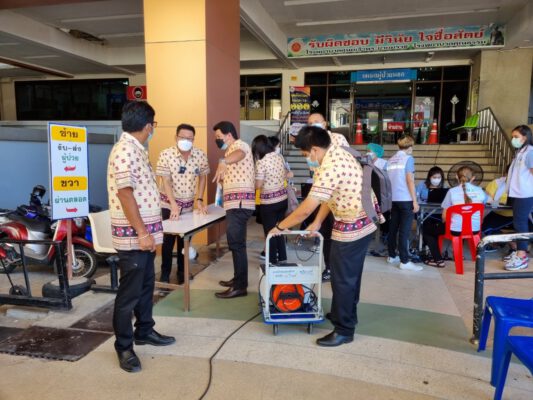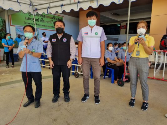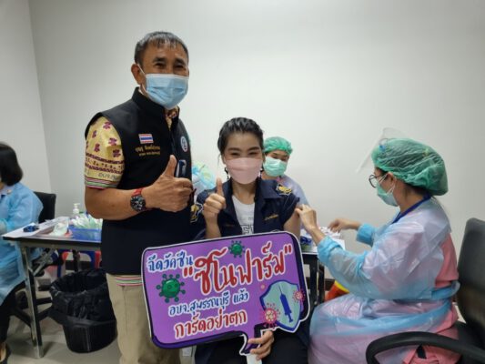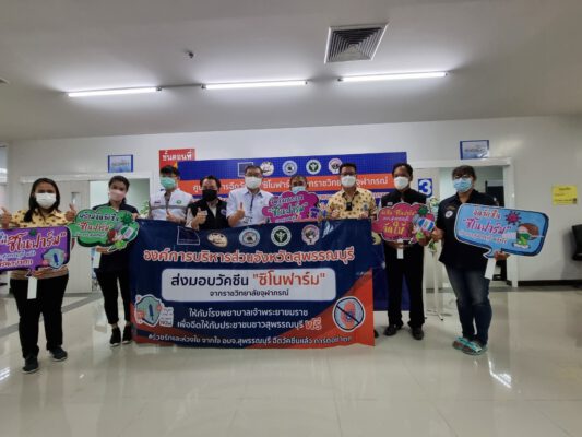 พนักงานองค์การบริหารส่วนจังหวัดสุพรรณบุรี และนายแพทย์พงษ์นรินทร์ ชาติรังสรรค์ ผู้อำนวยการโรงพยาบาลเจ้าพระยายมราช ร่วมลงพื้นอำนวยความสะดวกให้กับประชาชนที่เดินทางมารับบริการฉีดวัคซีน “ซิโนฟาร์ม” เข็มแรก ณ โรงพยาบาลเจ้าพระยายมราช