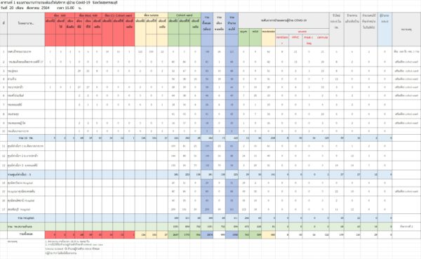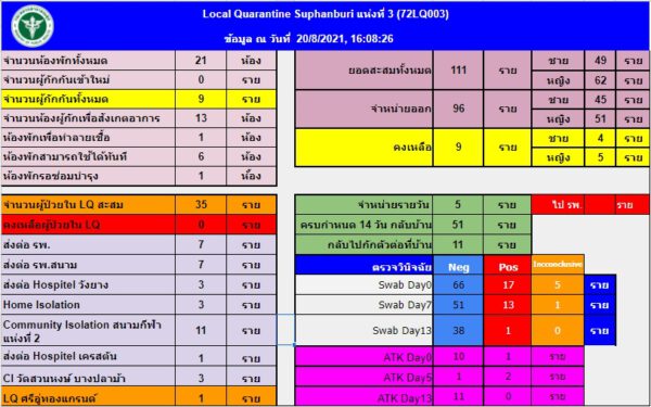 ด้าน Local Quarantine Suphanburi ข้อมูล ณ วันที่ 20 สิงหาคม 2564 เวลา 18.00 น. แห่งที่ 2 มีจำนวนห้องพักทั้งหมด 38 ห้อง อยู่ระหว่างซ่อมบำรุง 8 ห้อง พักเพื่อทำลายเชื้อ 1 ห้อง รอทำความสะอาด 12 ห้อง สามารถใช้ได้ทันที 5 ห้อง /แห่งที่ 3 มีจำนวนห้องพักทั้งหมด 22 ห้อง พักเพื่อทำลายเชื้อ 1 ห้อง อยู่ระหว่างซ่อมบำรุง 1 ห้อง สามารถใช้ได้ทันที 6 ห้อง