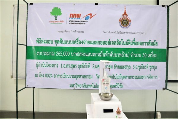 วิทยาลัยเทคโนโลยีอุตสาหกรรมและการจัดการ มหาวิทยาลัยเทคโนโลยีราชมงคลศรีวิชัย วิทยาเขตนครศรีธรรมราช พื้นที่ขนอม นำโดย ผู้ช่วยศาสตราจารย์ ดร.ขวัญหทัย ใจเปี่ยม ผู้อำนวยการวิทยาลัยฯ พร้อมด้วย ดร.สุพร ฤทธิภักดี หัวหน้าสาขาวิศวกรรม ผู้ช่วยศาสตราจารย์ ดร.อาคม ลักษณะสกุล อาจารย์ประจำหลักสุตรวิชาวิสวกรรมไฟฟ้าและ อาจารย์ชูเกียรติ ชูสกุล อาจารย์ประจำหลักสูตรวิศวกรรมโยธา พร้อมด้วยนักศึกษาและคณะทำงาน ส่งมอบเครื่องจ่ายแอลกอฮอล์เจลอัตโนมัติเพื่อลดการสัมผัส ให้กับหน่วยงานในพื้นที่ขนอมเพื่อสนับสนุนการดำเนินงานของทีมแพทย์ ณ ห้องปฏิบัติการวงจรไฟฟ้า วิทยาลัยเทคโนโลยีอุตสาหกรรมและการจัดการ ตำบลท้องเนียน อำเภอขนอม จังหวัดนครศรีธรรมราช โดยมีตัวแทนรับมอบจากหน่วยงาน นำโดย นายชาญศักดิ์ สุทธิช่วย ผู้จัดการกองทุนพัฒนาไฟฟ้าขนอม, นายสุนทร ปานเม่า นักจัดการงานทั่วไปปฏิบัติการ โรงพยาบาลขนอม, พท.เสาวลี คุ้มภัย แพทย์แผนไทย โรงพยาบาลขนอม และ นายกฤชปณต รณศิริ ผู้อำนวยการโรงพยาบาลส่งเสริมสุขภาพตำบลบ้านท่าจันทน์
