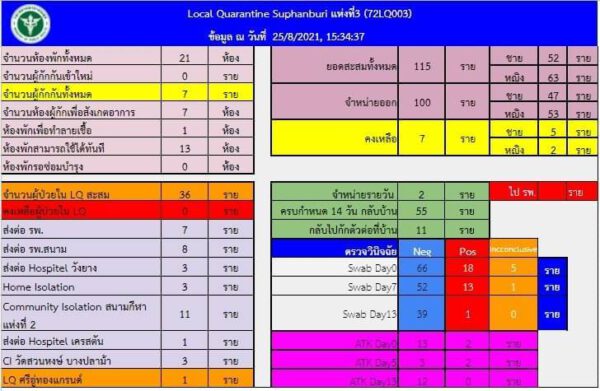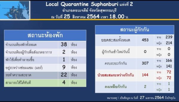 ด้าน Local Quarantine Suphanburi ข้อมูล ณ วันที่ 25 สิงหาคม 2564 เมื่อเวลา 18.00 น. แห่งที่ 2 มีจำนวนห้องพักทั้งหมด 38 ห้อง อยู่ระหว่างซ่อมบำรุง 9 ห้อง พักเพื่อทำลายเชื้อ 1 ห้อง รอทำความสะอาด 22 ห้อง สามารถใช้ได้ทันที 14 ห้อง /แห่งที่ 3 มีจำนวนห้องพักทั้งหมด 21 ห้อง พักเพื่อทำลายเชื้อ 1 ห้อง อยู่ระหว่างซ่อมบำรุง – ห้อง สามารถใช้ได้ทันที 12 ห้อง/แห่งที่ 4 มีห้องพักทั้งหมด 96 ห้อง พักเพื่อทำลายเชื้อ 8 ห้อง สามารถใช้ได้ทันที 22 ห้อง