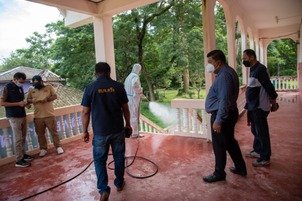 นายจารึก ทองหนัน รองนายกองค์การบริหารส่วนจังหวัดตรัง พร้อมเจ้าหน้าที่กองสาธารณสุข องค์การบริหารส่วนจังหวัดตรัง ฉีดพ่นยาฆ่าเชื้อป้องกันโควิด -19 รอบๆบริเวณโรงพยาบาลสนามชุมชน (Community Isolation) ที่ค่ายลูกเสือรัษฏานุประดิษฐ์ ตำบลช่อง อำเภอ นาโยง จังหวัดตรัง