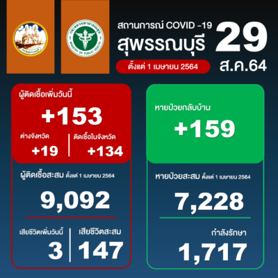สำหรับสถานการณ์โรค COVID-19 จังหวัดสุพรรณบุรี วันนี้มีผู้ติดเชื้อ 153 ราย รวมยอดจำนวนที่พบเชื้อสะสมระรอกใหม่ตั้งแต่ 1 เมษายน 2564 ถึงปัจจุบัน 9,092 ราย และรักษาหายแล้ว 7,228 ราย คงเหลือกำลังรักษาอีก 1,717 ราย เสียชีวิตเพิ่มวันนี้ 3ราย เสียชีวิตสะสม 147 ราย และรักษาหายแล้วกลับบ้าน 159 คน