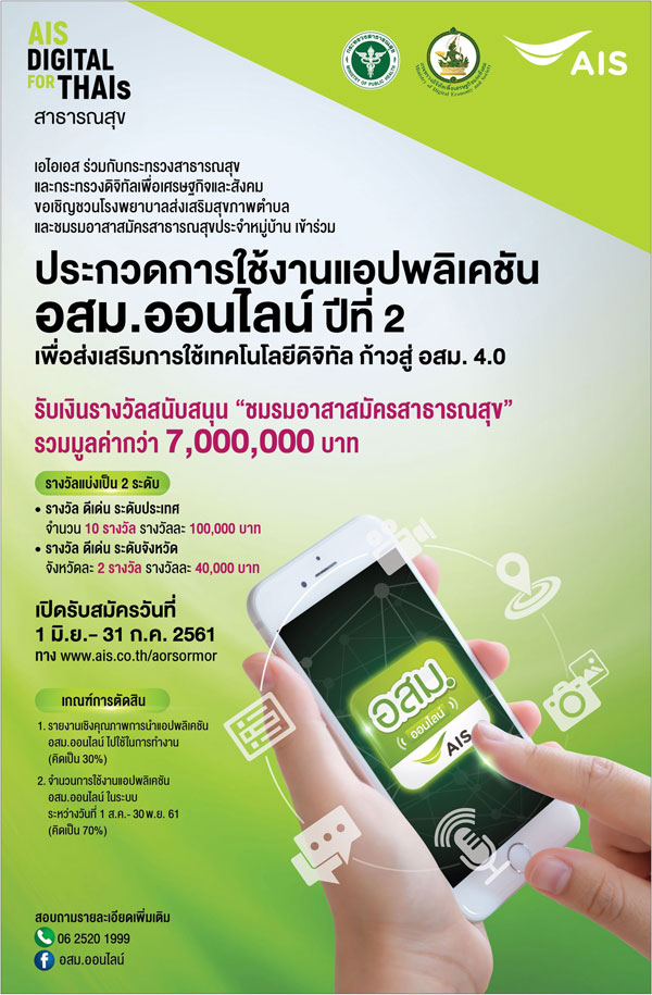ทั้งนี้เพื่อส่งเสริมศักยภาพของอสม.ให้มีความรู้ ความสามารถในการใช้เทคโนโลยีดิจิทัลในงานสาธารณสุขชุมชนเชิงรุกผ่านแอปพลิเคชัน อสม.ออนไลน์ เพื่อก้าวไปสู่ อสม.ยุค 4.0 เอไอเอส จึงได้ร่วมมือกระทรวงสาธารณสุข และกระทรวงดิจิทัลเพื่อเศรษฐกิจและสังคม (ดีอี) จัดโครงการ ประกวดการใช้งานแอปพลิเคชัน อสม.ออนไลน์ ต่อเนื่องเป็นปีที่ 2 โดยเชิญชวนหน่วยบริการสุขภาพระดับปฐมภูมิที่มีเครือข่ายอสม.ทุกแห่งทั่วประเทศเข้าร่วมประกวดเพื่อรับเงินรางวัลสนับสนุน “ชมรมอาสาสมัครสาธารณสุข” มูลค่ารวมกว่า 7 ล้านบาท โดยแบ่งรางวัล เป็น 2 ระดับ ได้แก่ รางวัลดีเด่นระดับประเทศ รางวัลละ 100,000 บาท จำนวน 10 รางวัล และรางวัลดีเด่นระดับจังหวัด รางวัลละ 40,000 บาท จังหวัดละ 2 รางวัล เปิดรับสมัครตั้งแต่วันที่ 1 มิถุนายน – 31 กรกฎาคม 2561