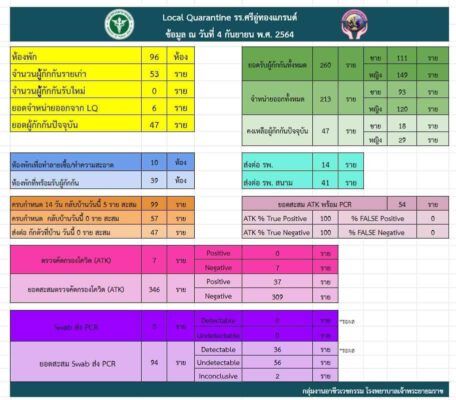 ด้าน Local Quarantine Suphanburi ข้อมูล ณ วันที่ 4 กันยายน 2564 เมื่อเวลา 18.00 น. แห่งที่ 4 มีห้องพักทั้งหมด 96 ห้อง พักเพื่อทำลายเชื้อ 10 ห้อง สามารถใช้ได้ทันที 39 ห้อง