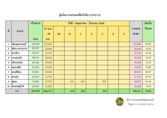 ขณะที่ยอดจำนวนผู้ลงทะเบียนขอรับการฉีดวัคซีน COVID-19 เมื่อวันที่ 5 กันยายน 2564 เวลา 19.30 น. มียอดรวมสะสม446,871 คน คิดเป็นร้อยละ 78.46