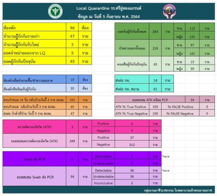 ด้าน Local Quarantine Suphanburi ข้อมูล ณ วันที่ 5 กันยายน 2564 เมื่อเวลา 18.00 น. แห่งที่ 4 มีห้องพักทั้งหมด 96 ห้อง พักเพื่อทำลายเชื้อ 10 ห้อง สามารถใช้ได้ทันที 35 ห้อง