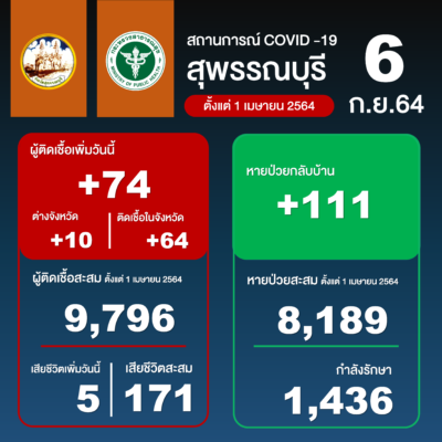 สำหรับสถานการณ์โรค COVID-19 จังหวัดสุพรรณบุรี วันนี้มีผู้ติดเชื้อ 74 ราย รวมยอดจำนวนที่พบเชื้อสะสมระรอกใหม่ตั้งแต่ 1 เมษายน 2564 ถึงปัจจุบัน 9,796 ราย และรักษาหายแล้ว 8,189 ราย คงเหลือกำลังรักษาอีก 1,436 ราย เสียชีวิตเพิ่มวันนี้ 5 ราย เสียชีวิตสะสม 171 ราย และรักษาหายแล้วกลับบ้าน 111 คน