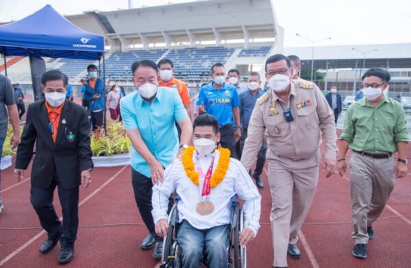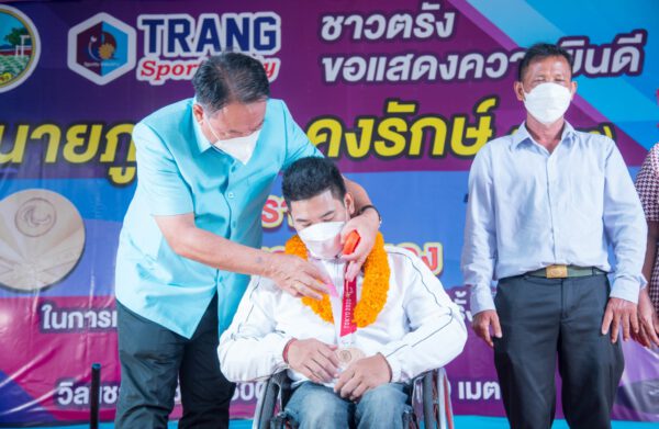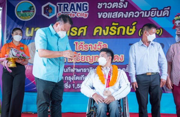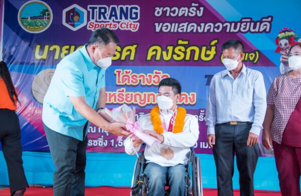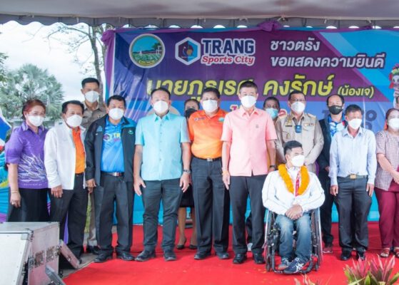 ที่สนามกีฬาฟุตบอล สนามกีฬาตรัง อ.เมืองตรัง นายขจรศักดิ์ เจริญโสภา ผู้ว่าราชการจังหวัดตรัง พร้อมด้วยนายไพบูลย์ โอมาก นายภูวนัฐ สมใจ รองผู้ว่าราชการจังหวัดตรัง นายบุ่นเล้ง โล่สถาพรพิพิธ นายก อบจ.ตรัง และหัวหน้าส่วนราชการ ร่วมมอบช่อดอกไม้ให้นักกีฬาผู้ทำคุณประโยชน์และสร้างชื่อเสียงให้กับประเทศไทยและจังหวัดตรัง ในกิจกรรมเชิดชูเกียรตินายภูธเรศ คงรักษ์ (น้องเจ) นักกีฬากรีฑาวีลแชร์เรซซิ่งทีมชาติไทย ซึ่งได้รับรางวัลชนะเลิศอันดับ 3 จำนวน 2 เหรียญทองแดง รายการแข่งขันกรีฑาวีลแชร์เรซซิ่งระยะ 1,500 เมตร และระยะ 5,000 เมตร ในการแข่งขันกีฬาพาราลิมปิกฤดูร้อน ครั้งที่ 16 ณ กรุงโตเกียว ประเทศญี่ปุ่น เมื่อวันที่ 24 สิงหาคม – 5 กันยายน 2564 โดยนายก อบจ.ตรัง ได้มอบสร้อยคอทองคำ จำนวน 1 เส้น เพื่อเป็นขวัญและกำลังใจให้กับน้องเจ อีกด้วย